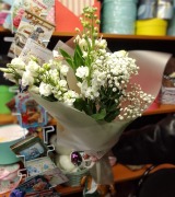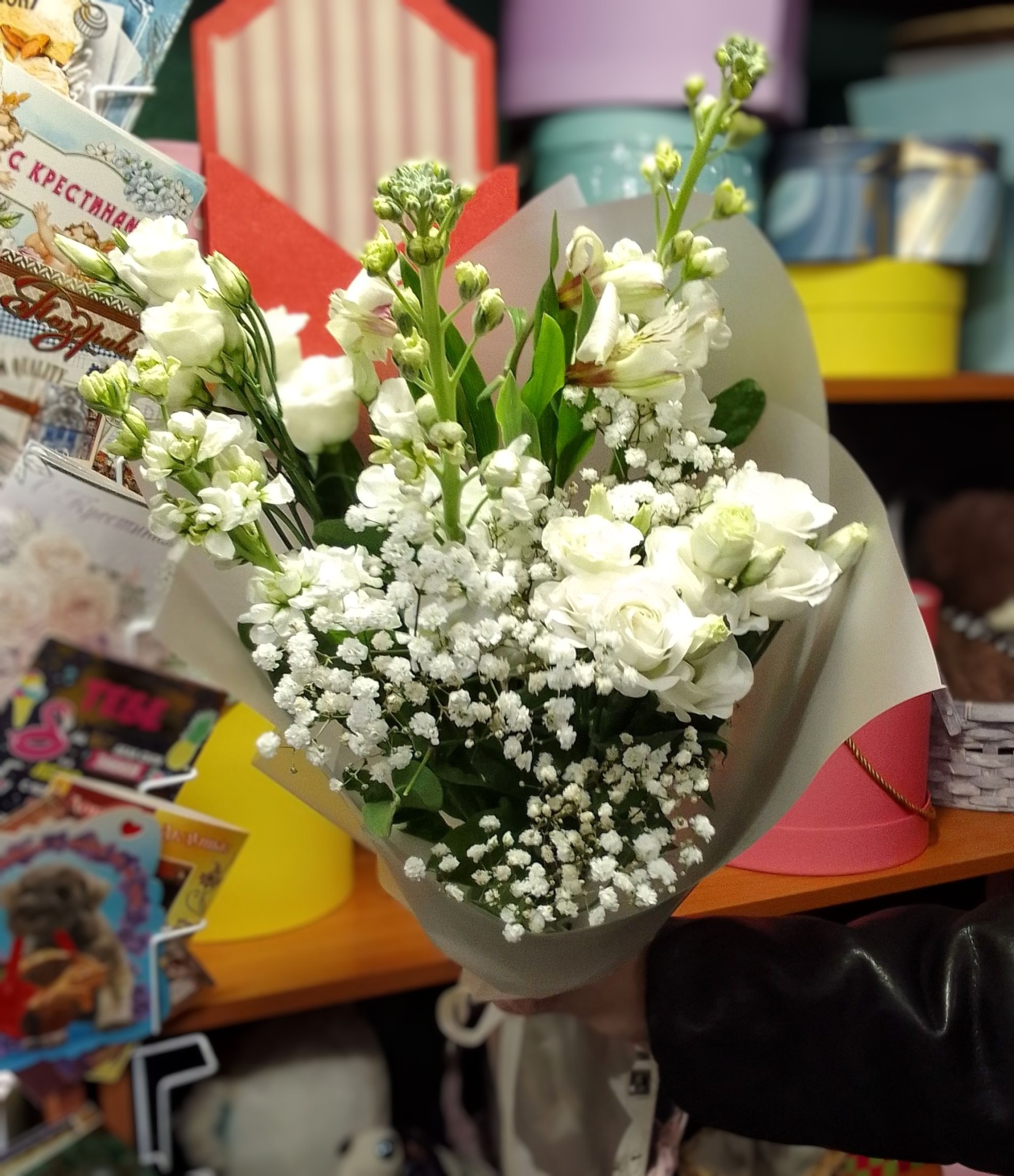 Состав: эустомы, матиола, гипсофилы, альстромерии, упаковка.