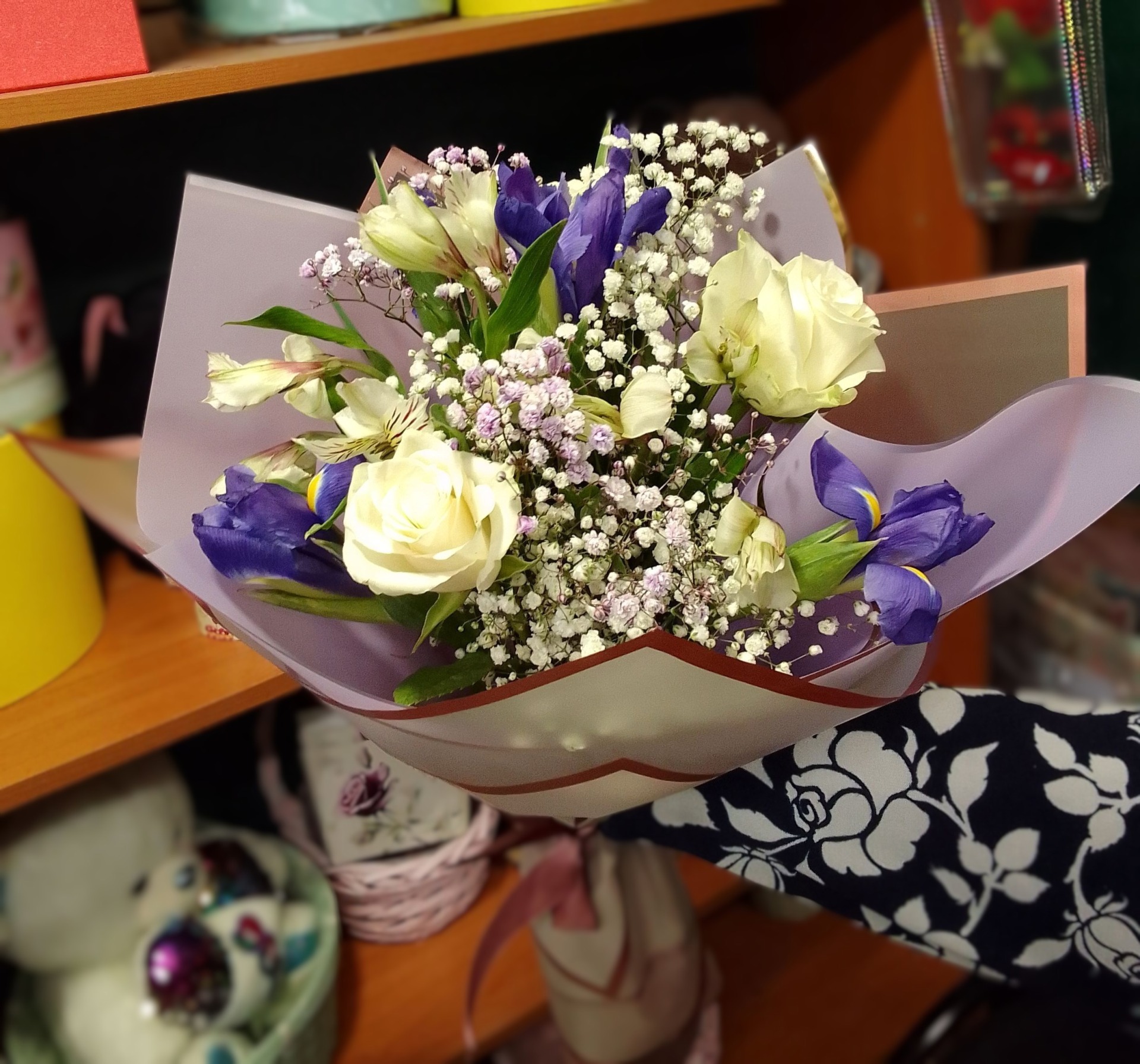 Состав: ирисы, розы, альстромерии, гипсофилы, флористическая пленка.