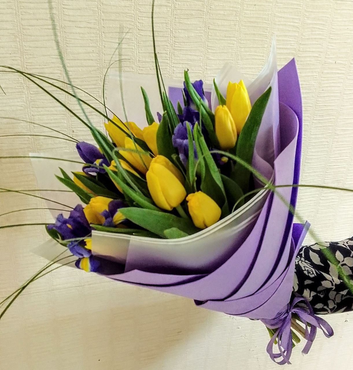 Состав: тюльпаны, ирисы, берграсс, упаковка.